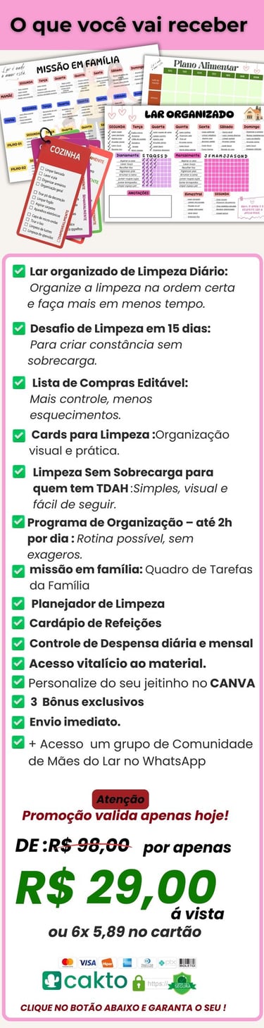Aceitamos PIX e cartão de crédito, com opção de parcelamento. O pagamento é processado pela Cakto Pagamentos e, após a confirmação, o acesso ao kit é liberado imediatamente.